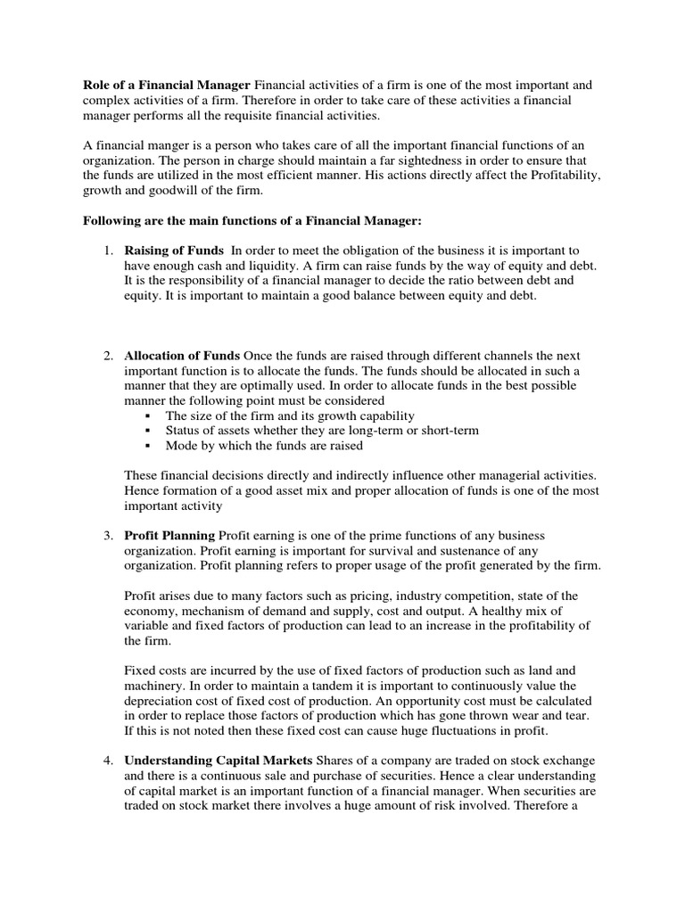 Corporate finance manager job description, duties, roles and responsibilities. They are the root of all major business decisions and their role is crucial to the success of any organization. Finance managers are business specialists who manage important financial functions of an organization. Financial managers are responsible for the financial health of an organization. He/she develops strategies and plans for financial goals with a lot of responsibilities, a financial manager plays an important, crucial role in the organization. Free bcom notes financial management role and responsibilities of a modern finance manager. The role is a very common destination for those in the financial field and for those with a strong grasp of numbers and good analytical and communication skills may 'this commercial position is a key role in finance but also the surrounding business. Manager must ensure they are safe from theft and misappropriation 3). They monitor daily transactions, oversee investments, and draft financial reports and forecasts. Finance managers promote a company's fiscal security. Finance managers may be employed in many. Financial manager responsibility # 3. Financial managers spend much of their time analyzing data and advising senior managers on ways to maximize profits.